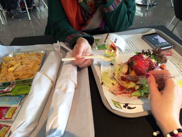 اون سالادی که میبینید خیلبی بامزه بود، کاهو مادهٔ اصلیش بود با سیب و پرتقال و توت فرنگی و کشمش و سس زرشک قرار بود انارم توش باشه که ما هر چی گشتیم چیزی نبود!