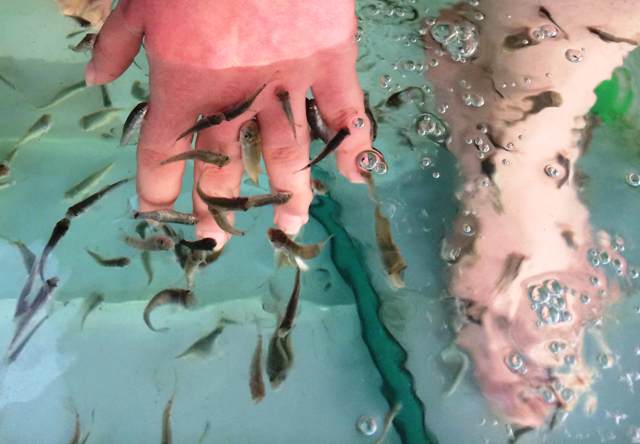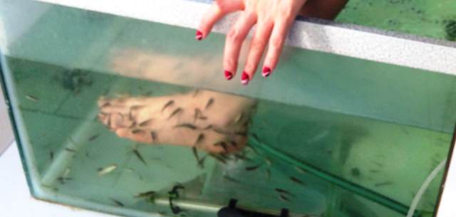 اول رفتیم داخل و پاهامون رو با آب شستیم بعدش رو صندلی نشستیم و پاهامون رو داخل آکواریوم فرو بردیم... البته که اول خانم خوجگله پاشو فرو برد! بعدشم شروع کرد به جیغ و داد و خندیدن !!! بعد من اونو دیدم دلهره گرفتم :))) حالا اونم داد میزد پاتو بکن تو پاتو بکن تو ..... تو منو آوردی اینجا زود باش پاتو بکن توووووو :))))